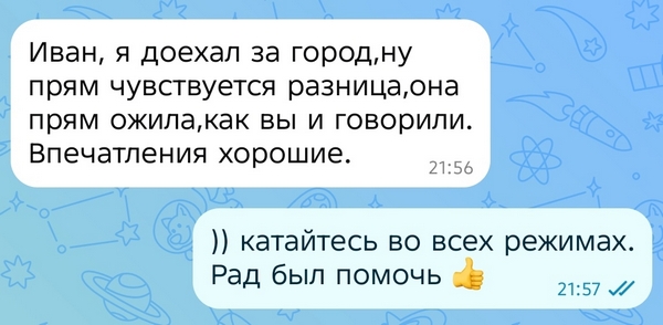 По отзывам владельца, автомобиль стал заметно увереннее при ускорениях и обгонах на трассе. В городской езде появилась приятная приёмистость.